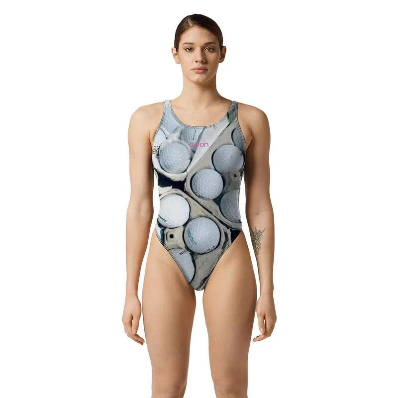 Dit zwempak heeft een opvallende op golf geïnspireerde print; vergeet niet “Fore” te roepen naar je vrienden in het zwembad.