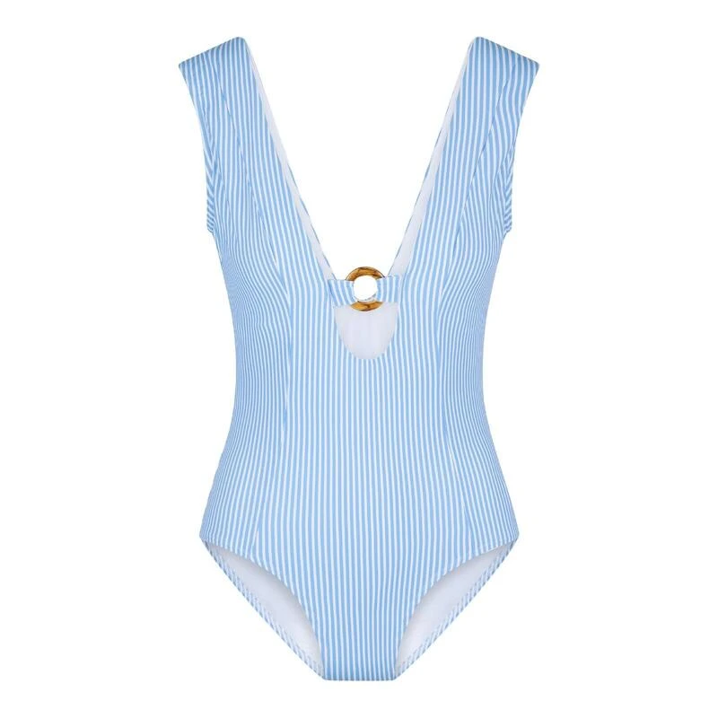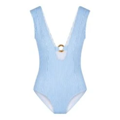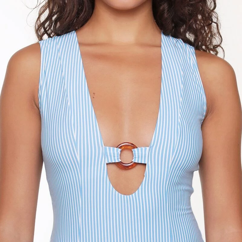 Blue Stripe Print… Blue stripes & tan lines! Deze frisse blauwe serie met Fishbone print is afgewerkt met mooie ring details. Let’s get tanned! Het swimsuit is niet voorgevormd en heeft geen beugel. De diepe cut-out en het ringdetail zorgen voor een sexy look.