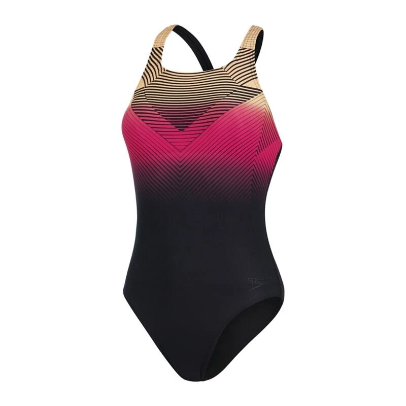 Vlieg door je fitnesstraining met ons Medalist badpak in verschillende kleuren met gebogen grafische lijnen en panelen met textuureffect. Onze populaire Medalist heeft een medium nek en pijpjes, plus een bescheiden rug voor een goede schouderbeweging en comfort tijdens de training. Lichte ondersteuning van de buste via een comfortabele onderband helpt je om je veilig en ondersteund te voelen. Ontworpen om duurzaam en beter voor het milieu te zijn, is het pak voorzien van onze duurzame nieuwe ECO Endurance+ stof die 100% chloorbestendig is, sneldrogend en gemaakt van 50% gerecyclede materialen.